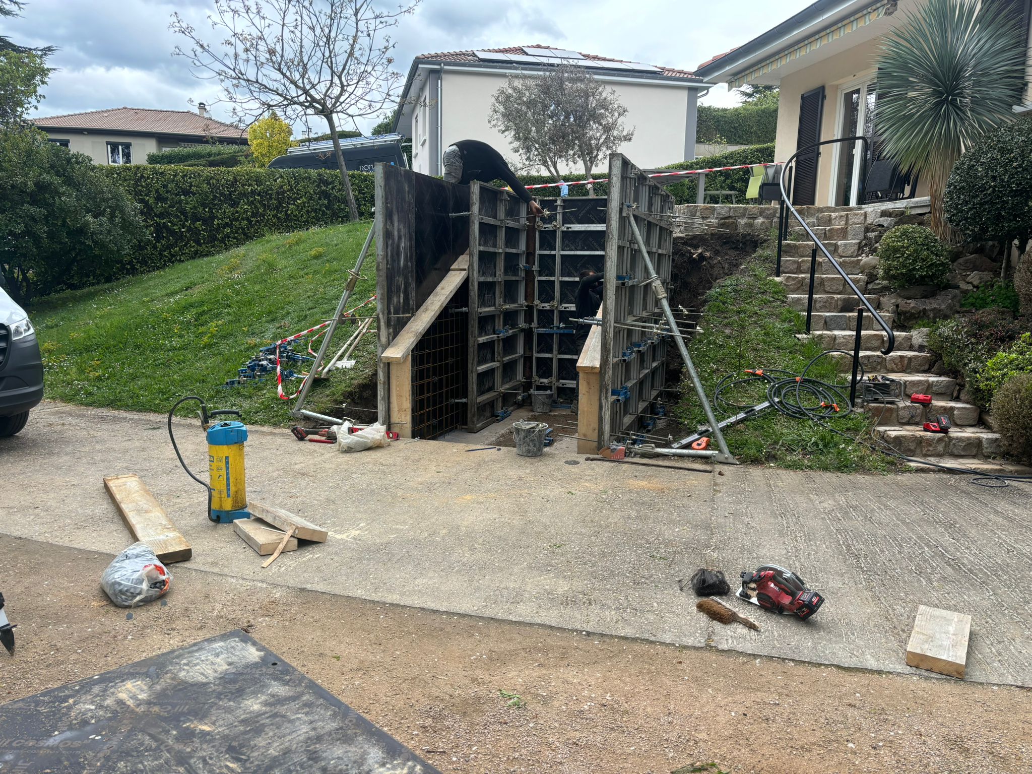 Ensuite, nous avons mis en place un système de ferraillage et de coffrage afin d’assurer la solidité de la structure en béton armé. Cette phase garantit la robustesse et la pérennité de l’installation.
